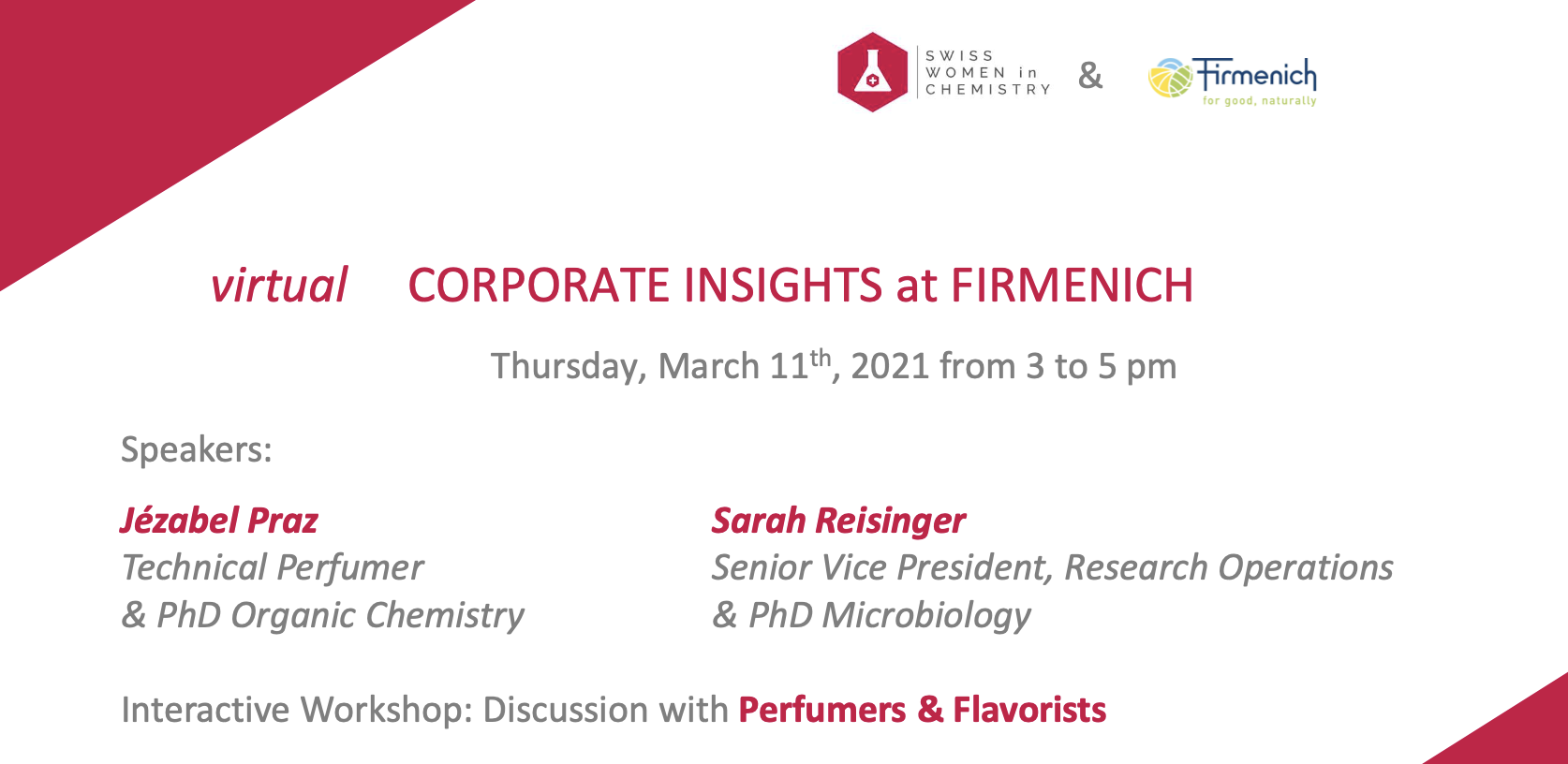 The 2nd virtual Corporate Insights event, co-organized by the Swiss Women in Chemistry (SWC) network & Firmenich, will take place on Thursday, March 11th2021 from 3 pm to 5pm. Â The event is open to anyone (all genders) studying in Switzerland and all SWC & SCS members.