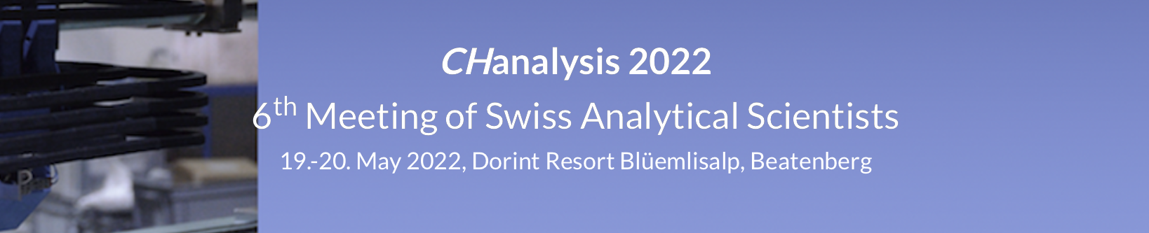 The Division Analytical Sciences of the Swiss Chemical Society (SCG/DAS) is organizing CHanalysis, a meeting of Swiss analytical scientists. We cordially invite you to participate in the next meeting in the Dorint Hotel in Beatenberg on May 19-20, 2022.