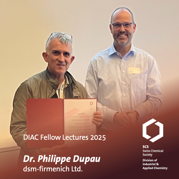 The meeting began with a welcome coffee, followed by an address from Dr. Olivier Lambrechts, President of Nutrition, Care & Environmental at Arxada, who set the stage for the day. Dr. Ulrich Mayerhöffer, Head of Technical Evaluation and Development, provided a comprehensive overview of “Arxada’s Chemical Network in Visp,” highlighting the site’s significance and innovative capabilities. Dr. Tanja Schaffer, Global Head BL CDMO at Arxada, then presented on “CDMO @ Arxada – towards customized net-zero solutions,” focusing on how Arxada is driving sustainability and tailored solutions in contract development and manufacturing. A key highlight was the DIAC Fellowship Award Ceremony, where Dr. Philippe Dupau (dsm-firmenich Ltd.) was honored for his outstanding contributions to the discovery, development, and industrial implementation of many innovative and robust catalytic methodologies for the sustainable and cost-efficient synthesis of iconic perfumery ingredients. Dr. Dupau delivered a short talk, offering insights into his research and the importance of innovation in the sector. We look forward to his DIAC Fellow lectures at Syngenta in Münchwilen (September 23, 2025), University of Bern (October 8, 2025) and the University of Geneva.