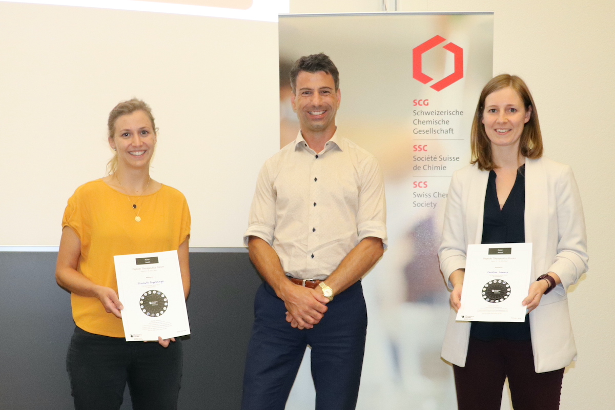 As part of the 2021 edition of the Peptide Therapeutics Forum 2021, taking place as a hybrid conference in Basel and online, the SCS also offered a virtual poster session and honored the best contributions with the ‘Chemistry Europe’ Best Poster Award. Two of the three winners were present on-site and David Spichiger, SCS Executive Director, handed over the certificates and the vouchers of CHF 100 from Wiley online library to the happy winners:
