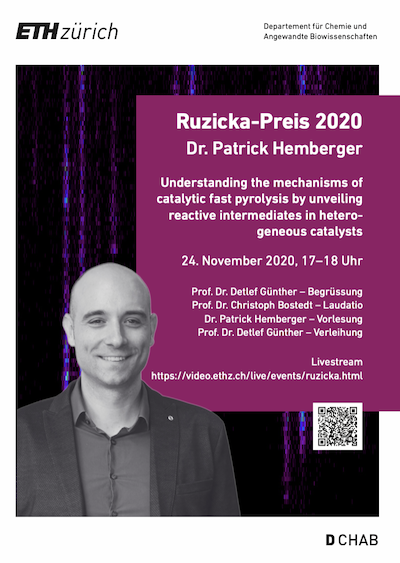 This year, Dr. Patrick Hemberger (PSI) receives the Ruzicka-Prize 2020 for his research on understanding the mechanisms of catalytic fast pyrolysis by unveiling reactive intermediates in heterogeneous catalysts.