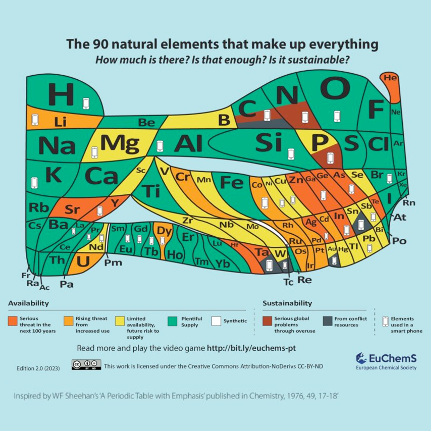 As a contribution to the celebrations of the International Year of the Periodic Table in 2019, EuChemS introduced a new version of the Periodic Table highlighting availability (area occupied by each element) and lifetime (colour). Also highlighted were the elements in smart phones and elements that can come from areas where wars are fought over the mines or the proceeds from the mines are used to fund wars – so-called conflict minerals.