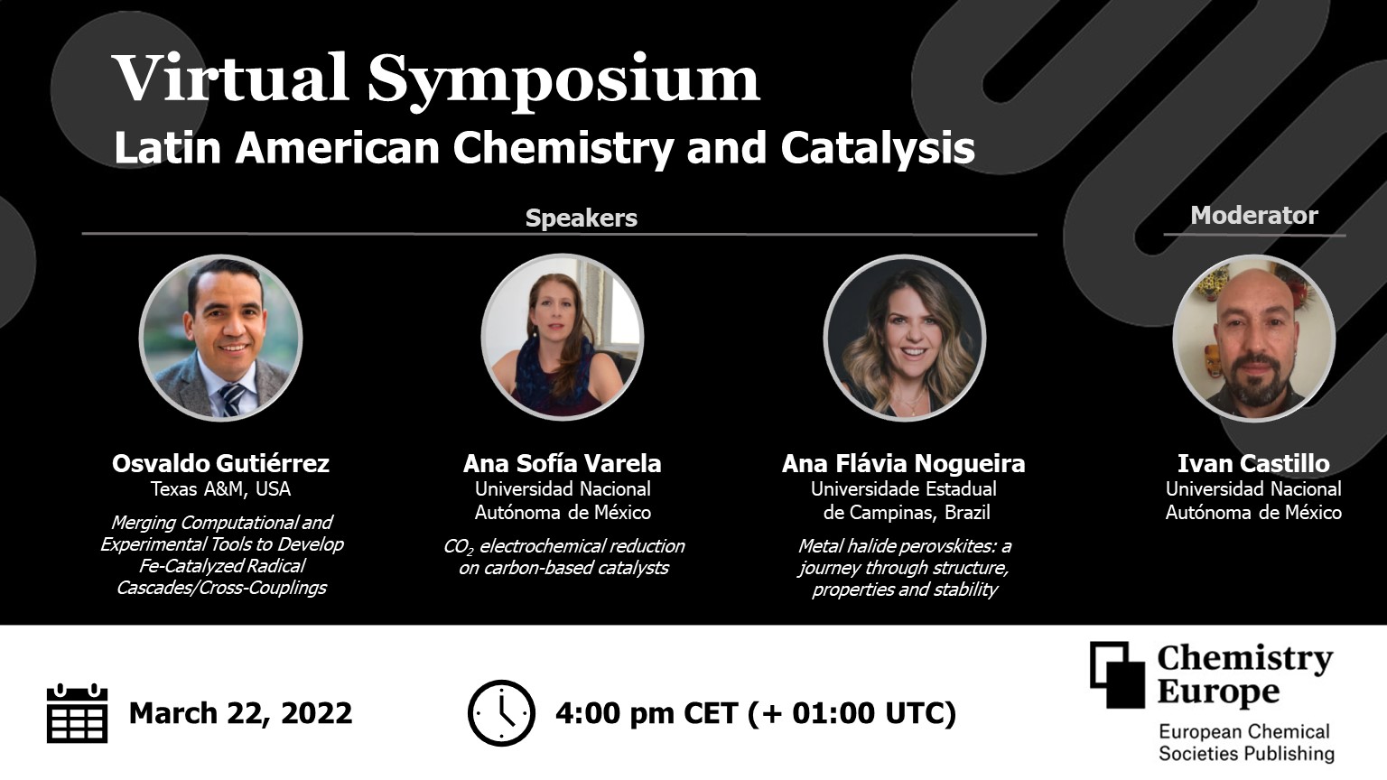 This exciting event will be moderated by Ivan Castillo (Instituto de QuĂmica, UNAM, Mexico) and hosted by Sandra González Gallardo (Deputy Editor, EurJIC and ChemCatChem). Please them and their speakers Osvaldo GutiĂ©rrez (Texas A&M University, USA), Ana SofĂa Varela (Universidad Nacional AutĂłnoma de MĂ©xico), andAna Flávia Nogueira (Universidade Estadual de Campinas, Brazil) for this virtual symposium. The topics will span from computational and experimental catalysis for organic synthesis to bioinorganic chemistry, electrocatalysis, and photocatalysis: