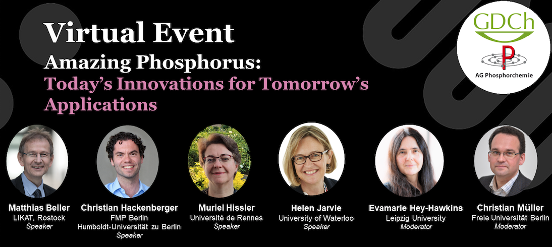ChemPlusChem is delighted to invite you for its virtual symposium on Amazing Phosphorus. This virtual event will be moderated by Evamarie Hey-Hawkins (Leipzig University), Christian Müller (Freie Universität Berlin) and hosted by ChemPlusChem Editor-in-Chief Jonathan Faiz.
